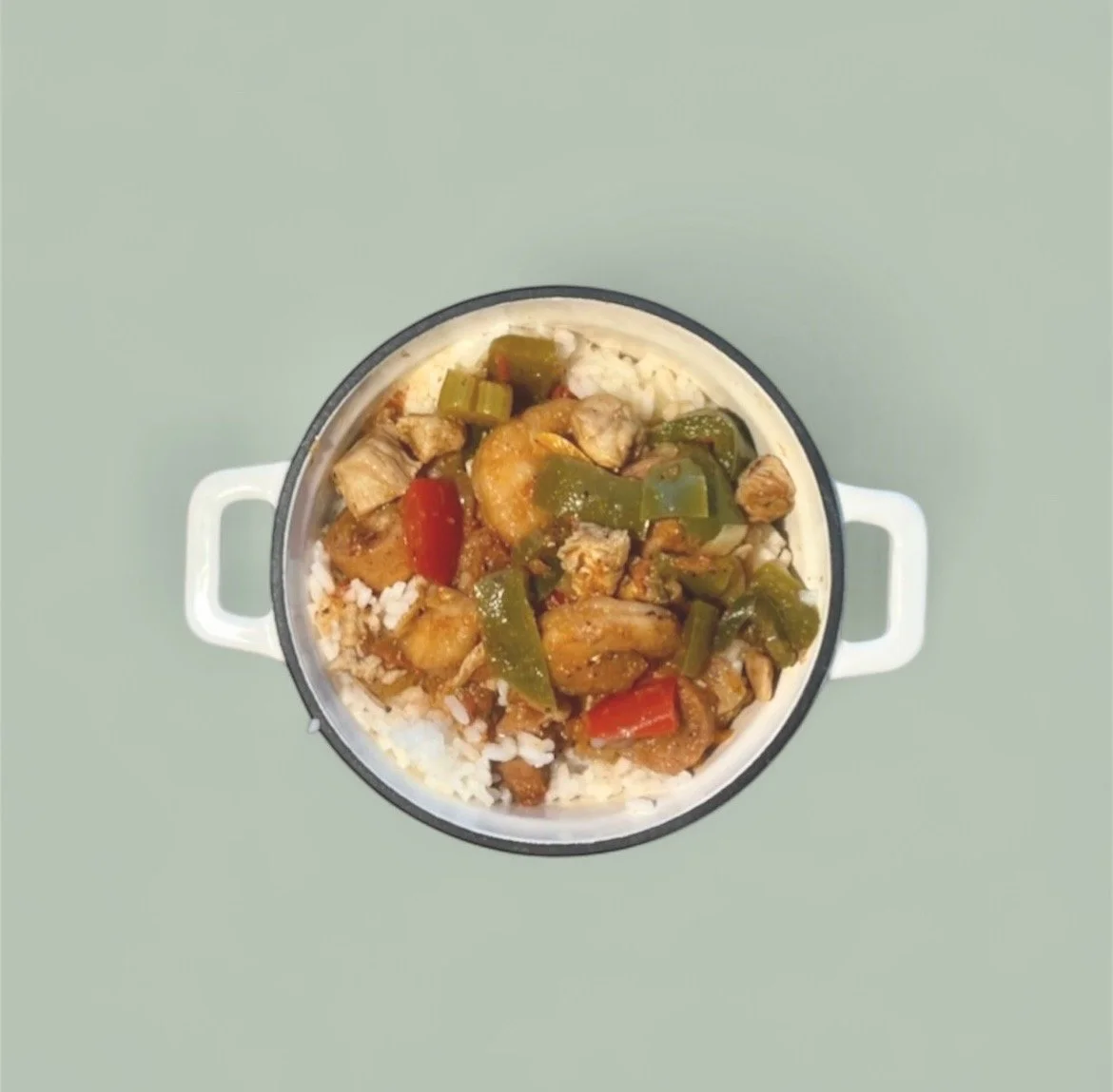 Bell peppers, chicken breast, chicken sausage (chicken, spices: parsley, crushed red pepper, paprika, extract of rosemary, onions, garlic, salt, vinegar), Roma tomatoes, shrimp, onions, celery, jalapeño, extra virgin olive oil, Himalayan pink sea salt, black pepper, paprika, ancho chili pepper, garlic powder, onion powder, white pepper, cayenne pepper. Just add rice.