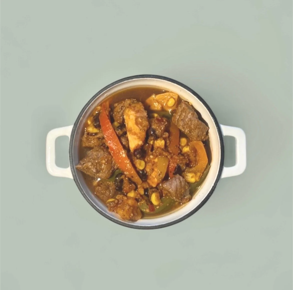Chuck roast beef, sweet potatoes, black beans, bell peppers, Roma tomatoes, sweet corn, onions, dried ancho chili pepper, Himalayan pink sea salt, paprika, cumin, garlic powder, cayenne pepper, just add broth.